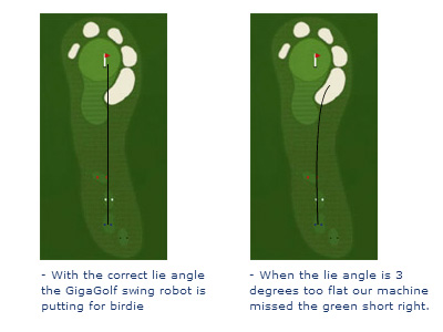 With the correct lie the GigaGolf swing robot was able to hit the target's centerline with ease (Offline = 0.0 +/- 2.2 yards. Carry distance = 140.7 yards +/- 2.4 yards). But when the GigaGolf robot's lie was flattened 3 degrees the shot dispersion was significantly right of the target line (Offline = 8.4 +/- 2.9 yards. Carry distance = 135.4 +/- 5.7). Not only did the robot hit the ball 25 feet right of the target, it also lost 15 feet of distance because the incorrect lie added loft and spin.
