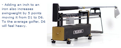 For example, GigaGolf's 8 irons are designed to be 36.5 inches long. At the length, the swingweight will be close to the industry standard of D1. Adding 1 inch to the club also adds 5 to 6 swingweights. Now the club swings at D7, which is noticeably heavy to the average golfer. Some players like longer heavy clubs but most will hit the ball more consistently with lengths closer to standard.